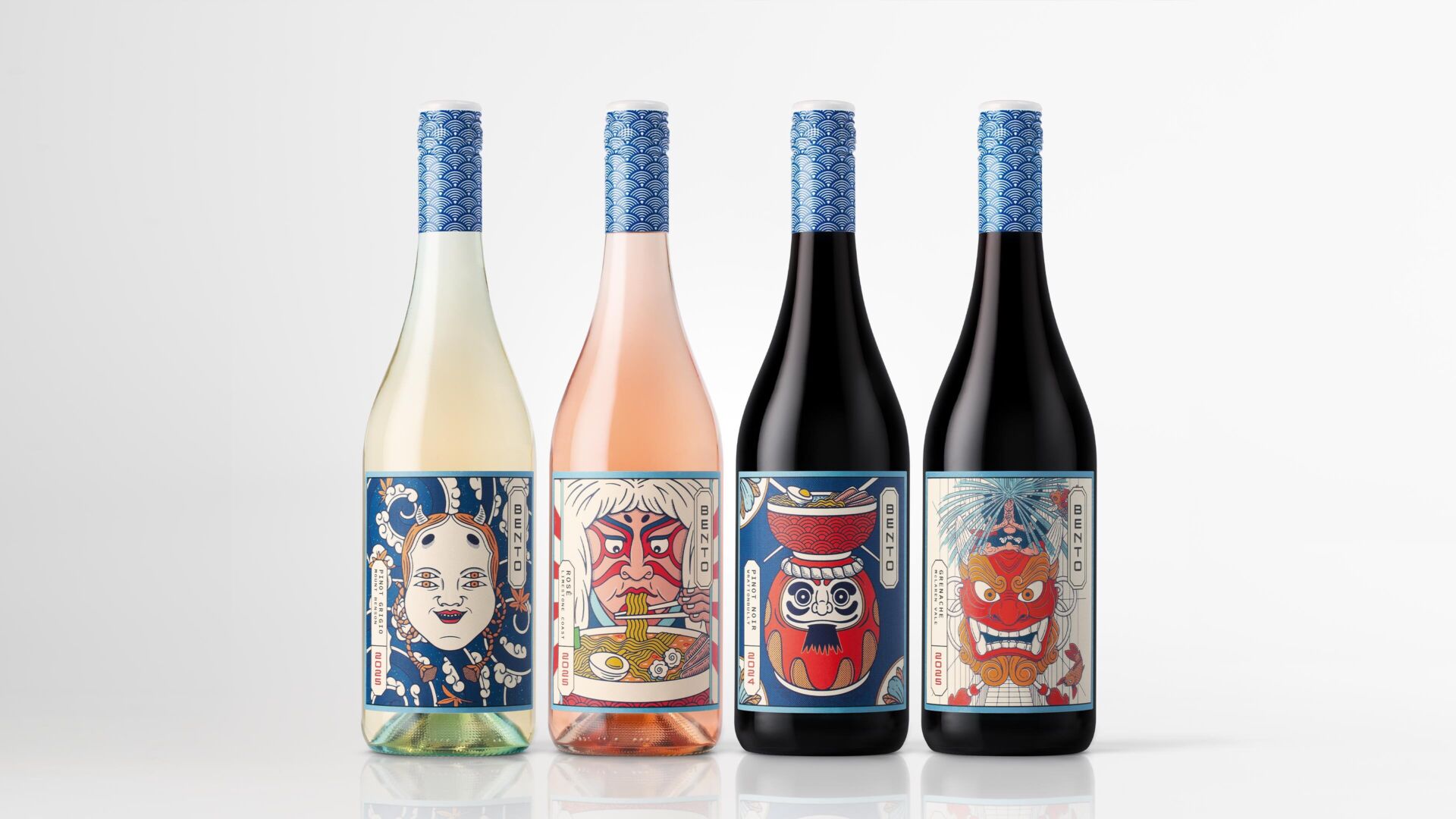 Every design element reinforces cultural relevance, from vertically stacked varietal information housed in an elongated lozenge, to the use of red typographic accents referencing traditional Japanese art, and a capsule inspired by blue-toned Japanese ceramics. The result is a wine brand that feels confident, approachable and purpose-built, meeting modern consumers at the intersection of food, culture and everyday drinking occasions.