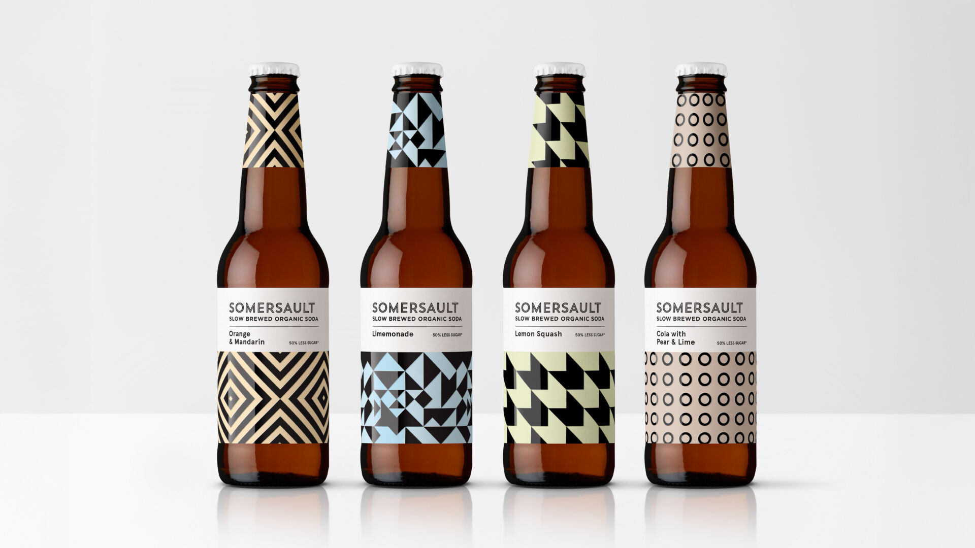 In a bid to create an Instagram-worthy design which would meet the client’s brief to be “art on a shelf”, Denomination’s dramatic solution for Somersault, broke all conventional “soft drink” genres, yet aligned in terms of natural colours and serious impact on shelf. We looked to fashion and art to inspire these designs: pieces such as Gucci’s Chevron dress and pattern artists from Anni Albers to Andy Gilmore, all cleverly combine strong and pale colours in satisfying repetitive form. So we used black as the common colour and combined with unusual yet “natural” toned pastels to bring a very modern, distinctive and unusual treatment to this soft drink pack. The typography is clean and modern but with detailing to add a level of sophistication to this adult-orientated soft drink. Brown glass was chosen for its semiotics of naturalness and wellbeing cues.